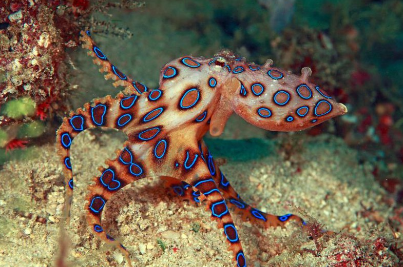 Ảnh: bạch tuộc đốm xanh trông có vẻ hiền lành nhưng thực ra chúng chứa chất độc cực mạnh đủ giết người trong chớp mắt.